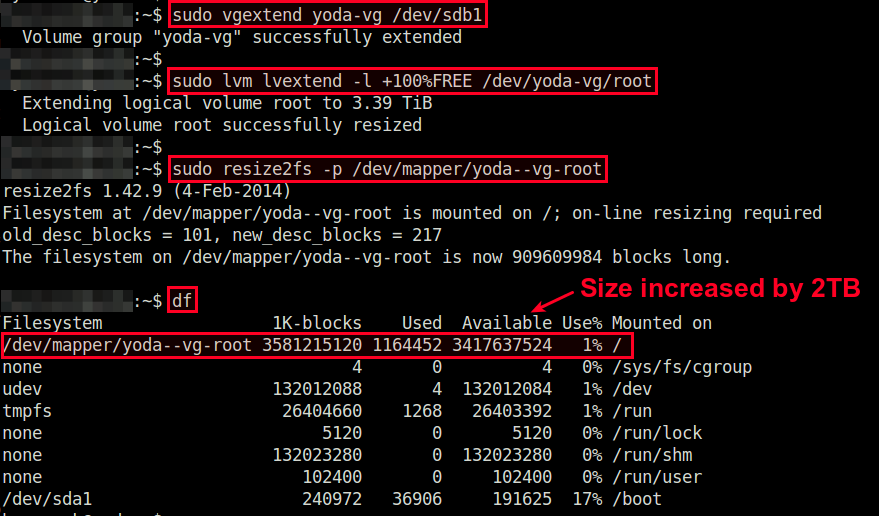 $ sudo resize2fs -p /dev/mapper/yoda--vg-root