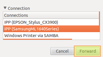 2) At the bottom we will see the names of the available printers. Let's choose the Samsung printer and press Forward: