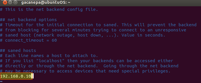 3) Let's edit the /etc/sane.d/net.conf file, and add the IP address of the server where the scanner is installed: