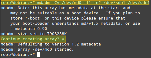 Once you are done with creating the primary partition on each drive, use the following command to create a RAID-1 array: