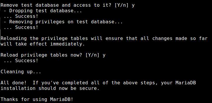 After launching MariaDB/MySQL server successfully, execute the following add-on script that comes with MariaDB/MySQL server package. This one-time run conducts several security hardening steps for the database server, such as setting the (non-empty) root password, removing anonymous user, and locking down remote access.