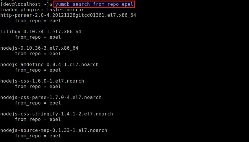 yumdbIf you are interested in a specific repository only, another useful tool is the yumdb command. This utility queries the local yum database to find information about installed packages. The yum database is a flat file key-value store generated by the yum command to store any package-specific information.